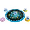 Contenu de la boîte : 1 plateau de jeu (8 pièces à assembler), 4 boules magiques, 4 apprentis sorciers, 4 supports pour boules magiques, 4 plaquettes de 34 jetons d’indications chacune, 1 règle du jeu.