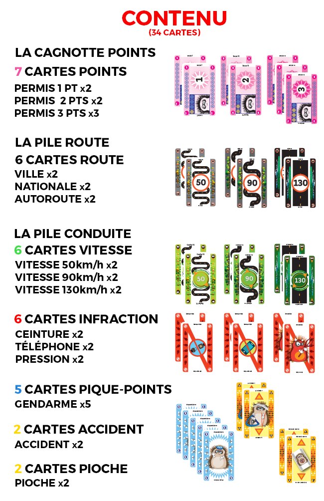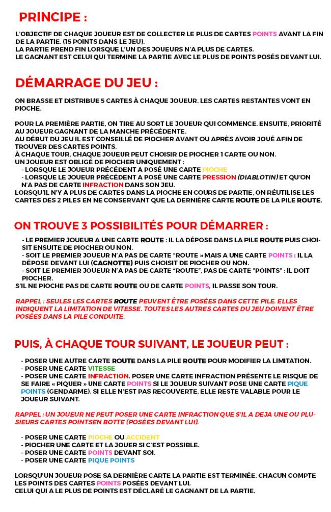 Les règles du jeu pique points son simples : l’objectif est de cumuler le maximum de points (15 points dans le jeu). Le jeu se termine lorsqu’il n’y a plus de cartes. Le joueur ayant cumulé le plus de points remporte la partie. Ce jeu de sécurité routière personnalisé permet notamment de sensibiliser aux excès de vitesse et autres infractions. En effet, lorsqu’un joueur dépose sur le jeu une carte excès de vitesse ou infraction, ce dernier peut se faire piquer ses points si un autre joueur dépose une carte gendarme.