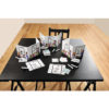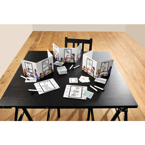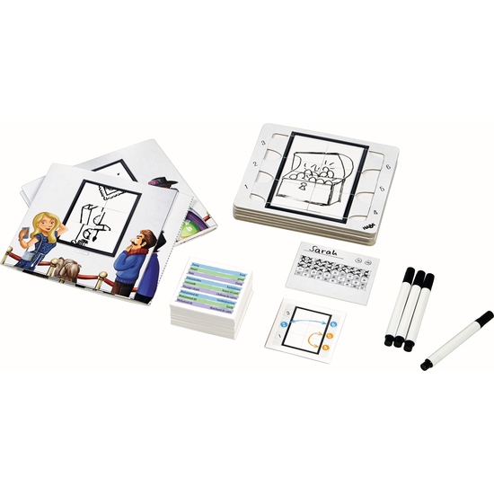 6 planches à dessin effaçables à sec, 6 feutres effaçables à sec, 6 paravents à rabat transparent et autocollant, 6 cartes de score, 150 cartes avec des mots, 7 cartes d’échange, 18 cartes pays, 1 règle du jeu.