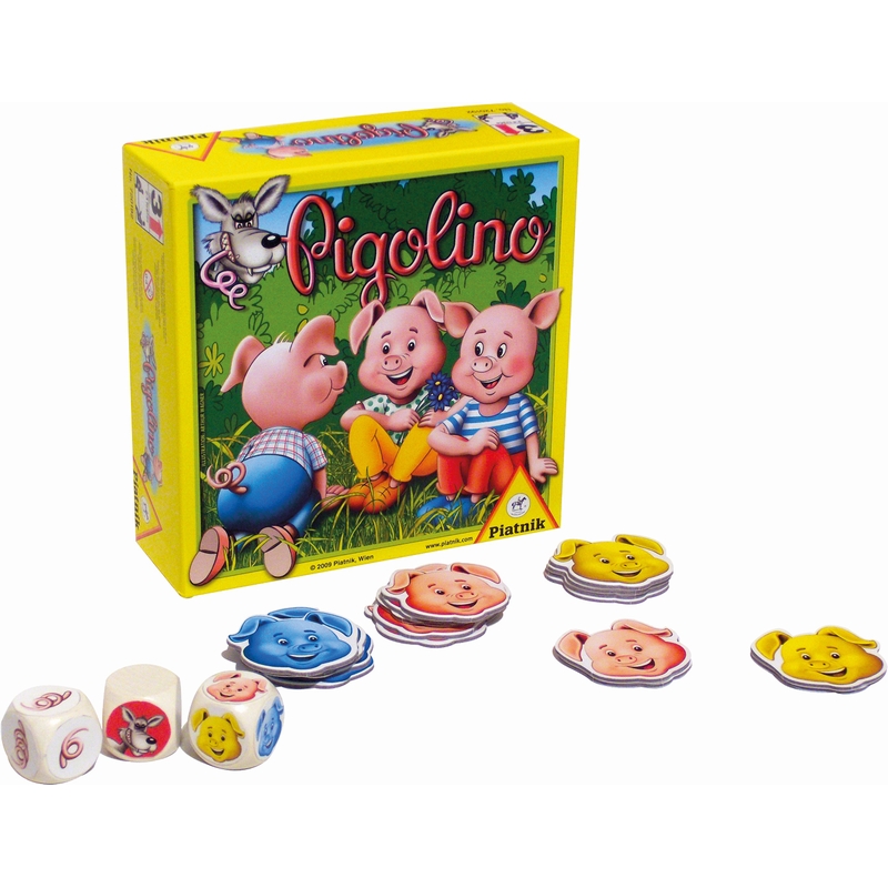 Pigolino… Au pays des petits cochons, il faut se construire et surtout fuir le loup ! Un premier jeu de hasard et de suspense, avec 3 gros dés pour apprendre aux enfants à suivre une règle.