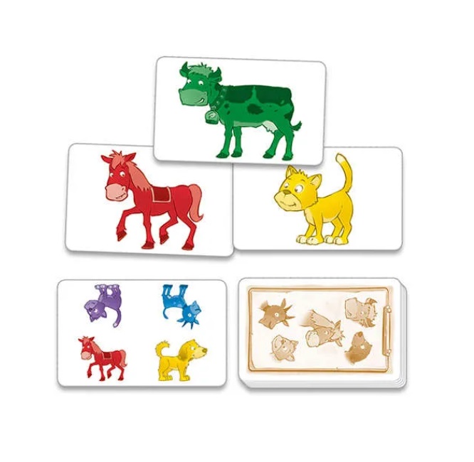 Les animaux du fermier Pippo sont tous uniques : il y a des chevaux, des cochons, des chats, des chiens et des vaches, tous combinés en 5 couleurs différentes. A chaque tour, on retourne une carte qui présente 4 animaux dans 4 couleurs. Vite ! Il faut chercher l’animal manquant dans la bonne couleur. Le premier qui le trouve gagne la carte. Quand toutes les cartes ont été trouvées, celui qui en a le plus a gagné.