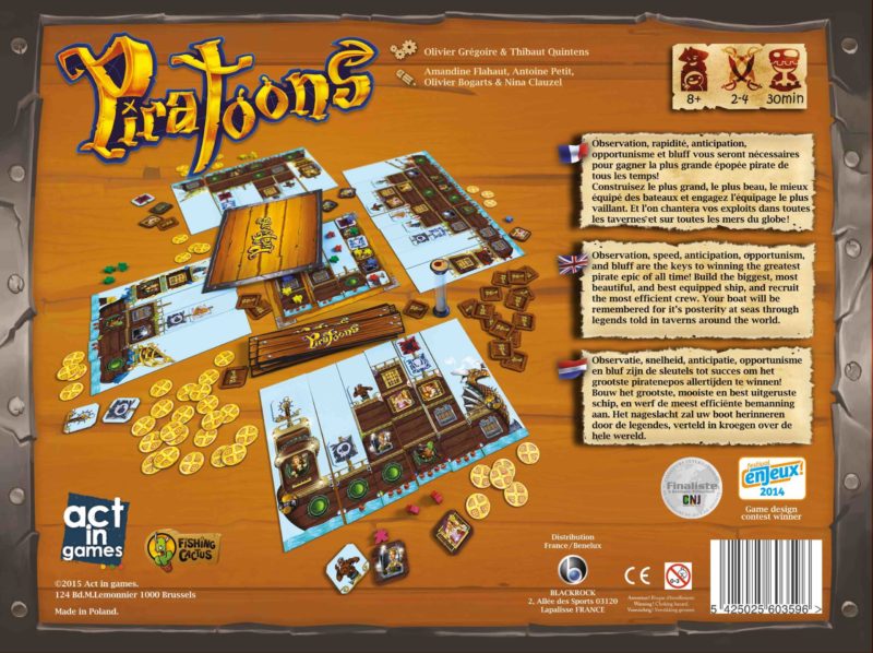 Dans le jeu Piratoons, pour s’aventurer en mer et écrire la légende des plus grands pirates vous allez devoir équiper votre bâteau, avec sang-froid et dextérité. Chaque joueur est un aspirant pirate de légende et chacun va devoir agrandir son bâteau et l’équiper de manière appropriée. Le vainqueur sera celui qui aura construit le meilleur bâteau: le plus grand, le plus rapide et le mieux équipé.