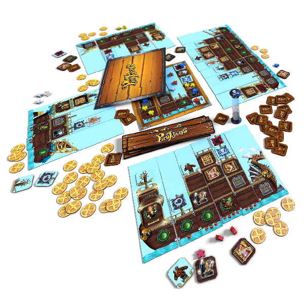 Au début de la partie, chaque joueur reçoit 2 segments de bateau : une proue et une poupe, une petite poignée de pièces, et quelques meeples (figurines en bois) de pirates en charge de l’équipement et du recrutement du bâteau.