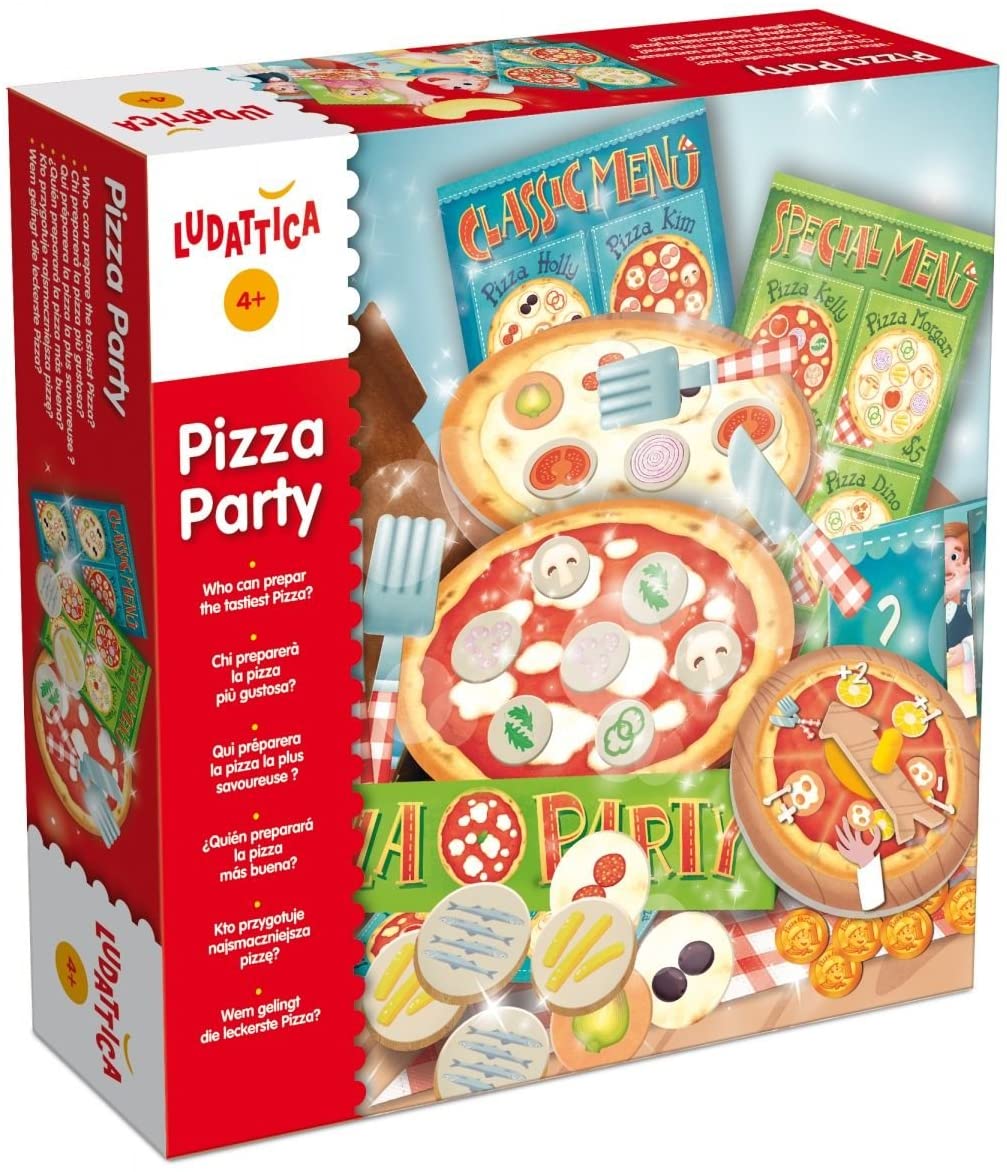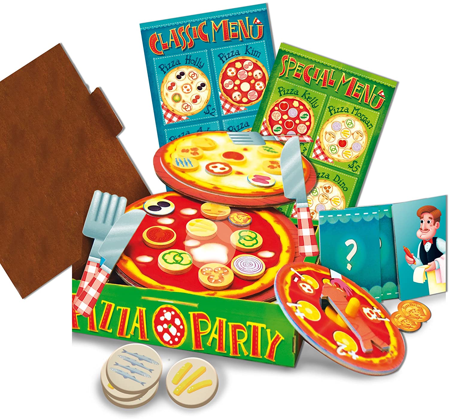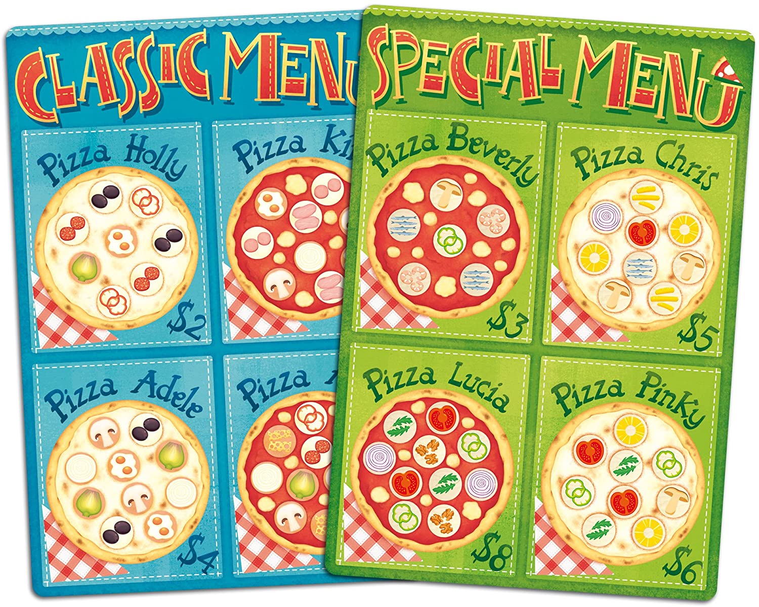 Contenu : 2 plats à pizza en carton, 2 pizzas en cartons, 30 cartes ingrédients en carton, 20 ingrédients spéciaux en bois, 6 cartes rigide « challenge », 3 cartes rôle, 2 menus en carte rigide, 1 chevalet de « table réservé » en carton, 1 plateau tournant en carton, 16 pièces de monnaie en carton, 2 fourchettes en plastique, 2 couteaux en plastique, 2 serviette en papier, 2 napperons en papier, 1 boite à pizza à emporter en carton, 1 livret d’instruction.