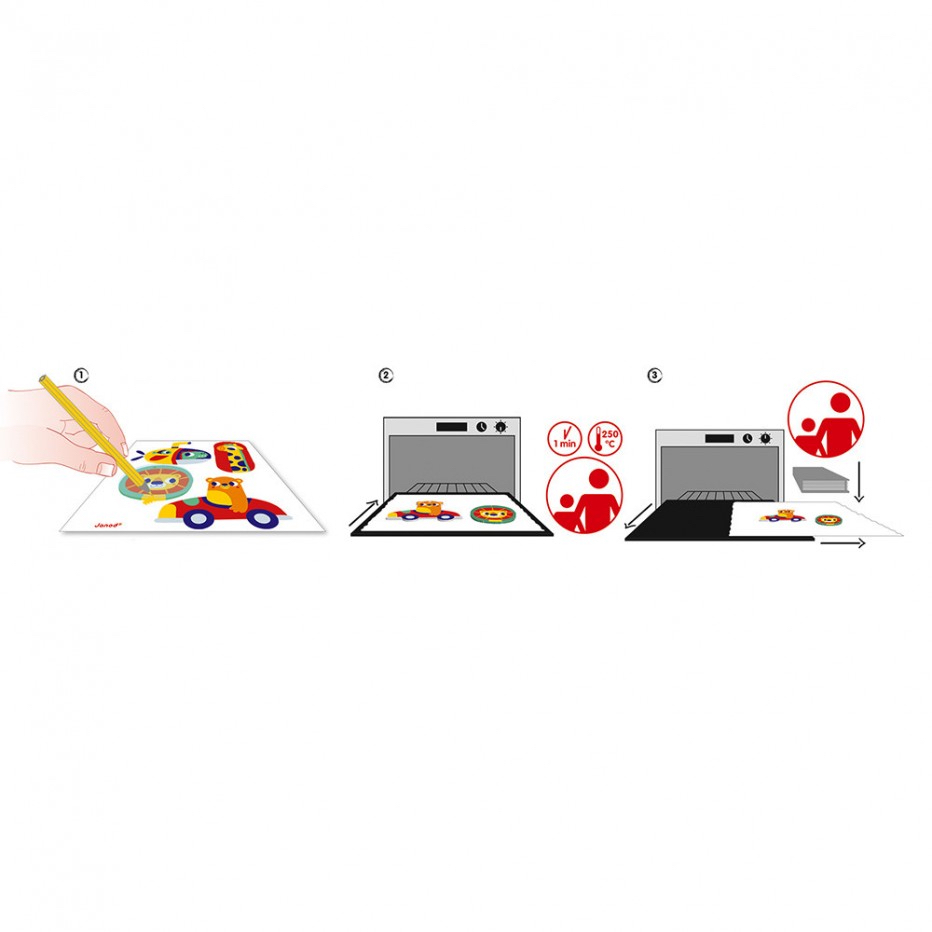 Il suffit de colorier les formes prédécoupées en plastique fou en décalquant les modèles, de les faire cuire au four et de les fixer aux magnets autocollants ou au porte-clés. Simple et spectaculaire.