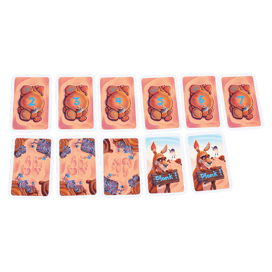 1. Vous avez trois kangourous sur le plateau et onze cartes devant vous (six cartes numérotées entre 2 à 7, deux cartes « Plonk! » et trois empreintes de pattes)