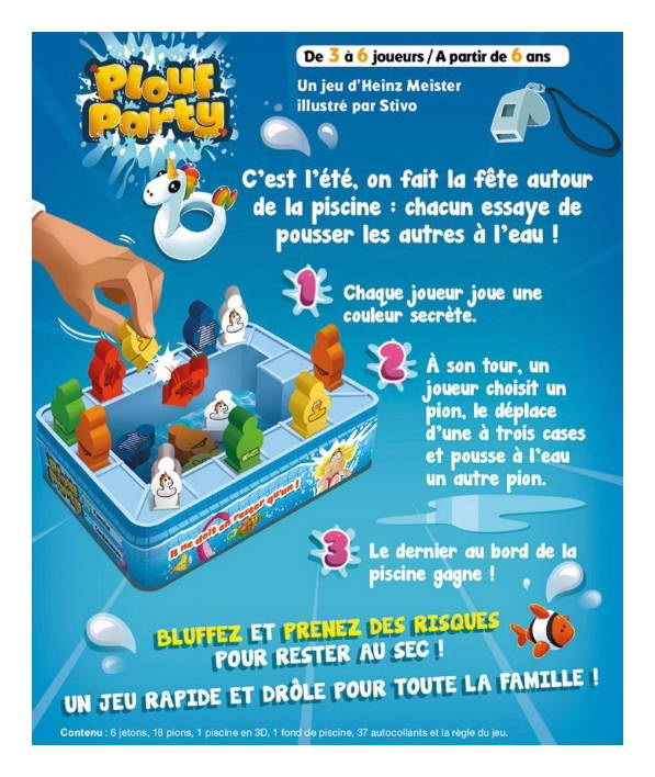 Jeu de bain, jeu de vilains ! Poussez les autres pions à l’eau pour être le dernier au sec sur le bord de la piscine ! Plouf Party est un jeu d’ambiance très simple et amusant pour 2 à 6 joueurs.