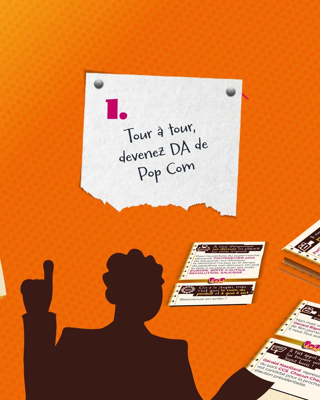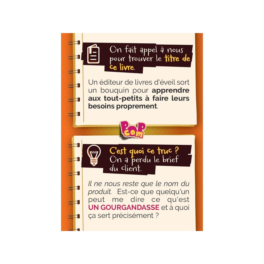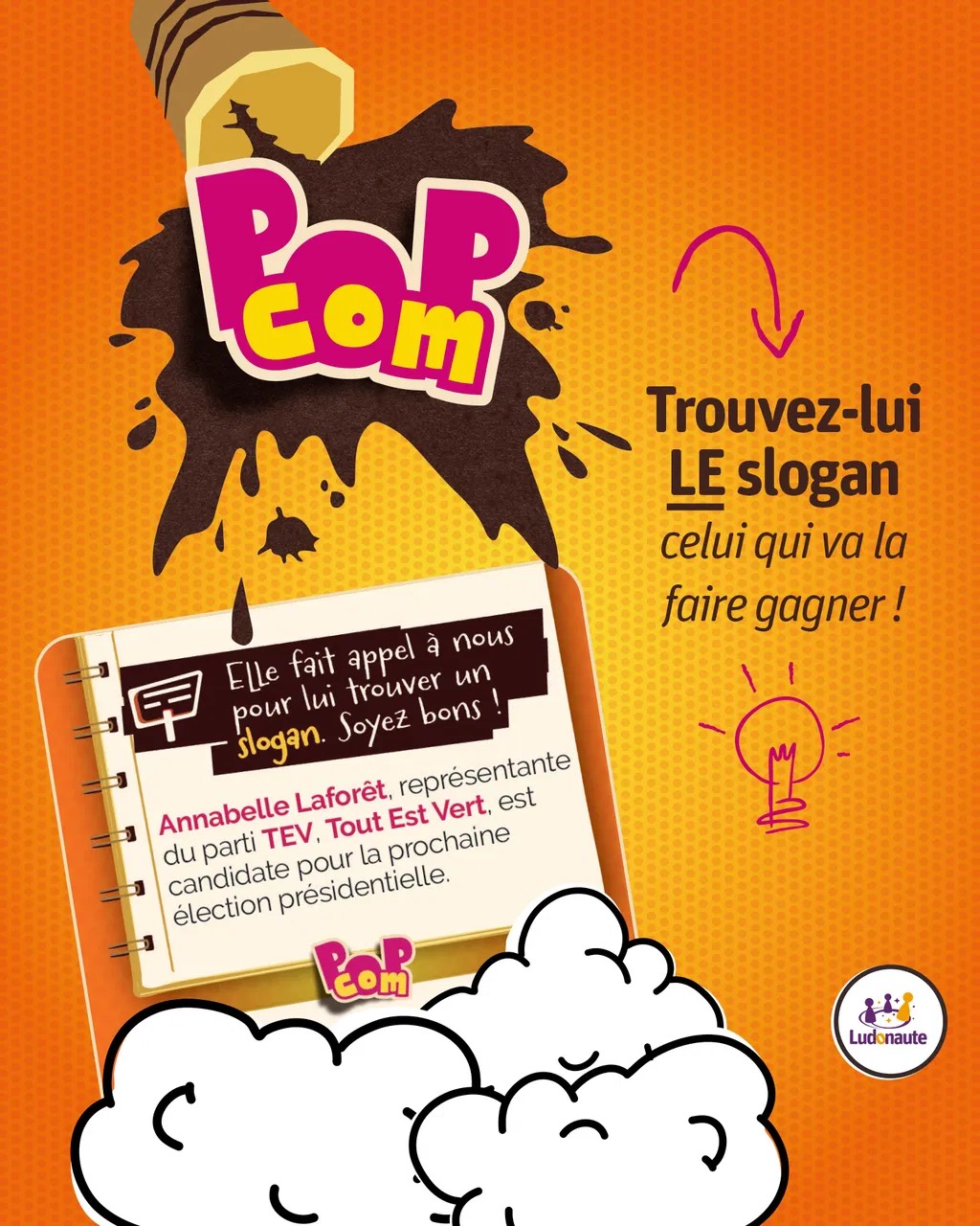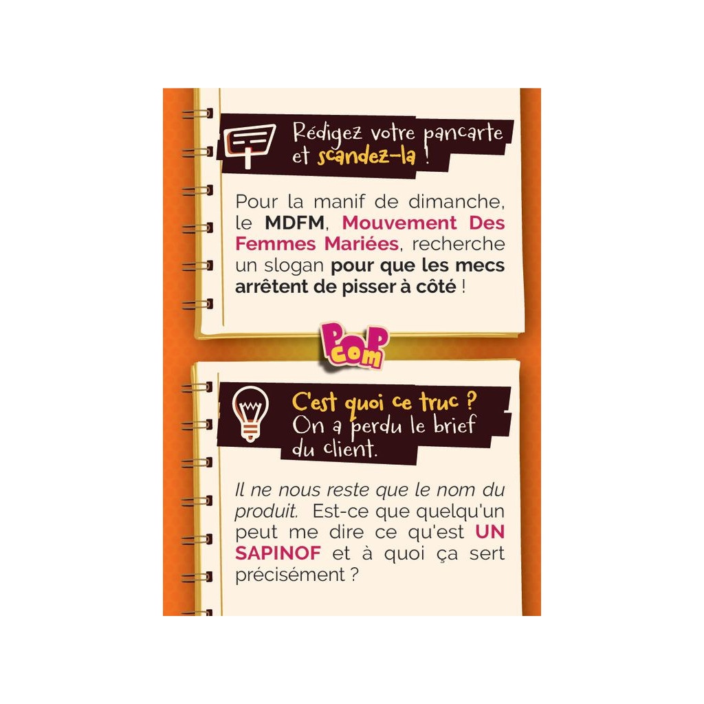 Bienvenue chez Pop Com ! La crème des agences publicitaires et pour briller il va falloir avoir du génie ! Vous allez tour à tour rédiger des slogans, dessiner des logos, prendre la pose, jouer la comédie, et même faire la voix off d’une publicité. Alors, à vous de jouer : sublimez les campagnes de pub avec vos idées innovantes et votre créativité débordante. Plongez dans l’aventure publicitaire et faites briller Pop Com de tout votre talent ! Un jeu d’ambiance stimulant et créatifs ponctués de challenges déjantés hilarants.