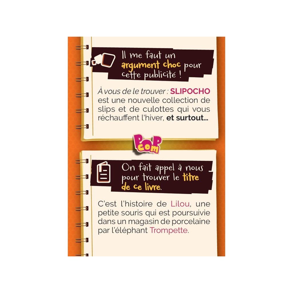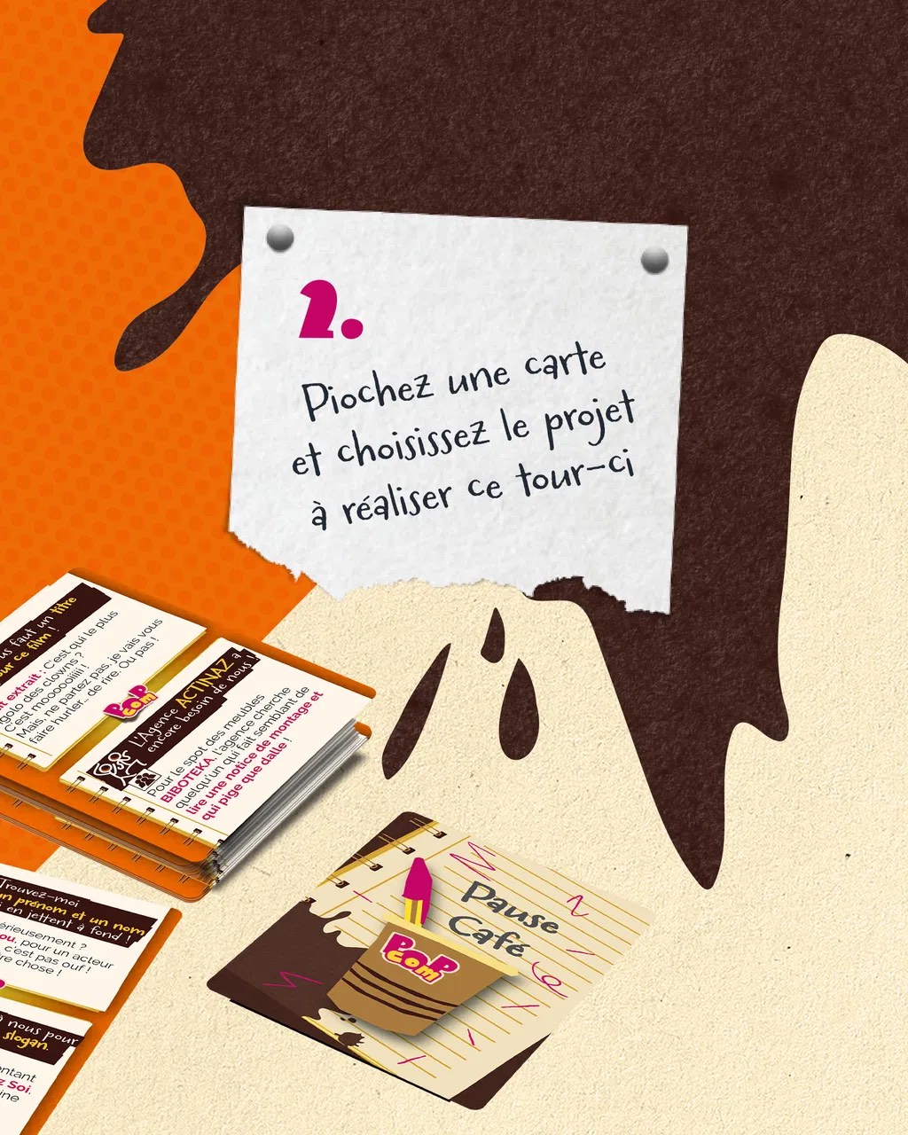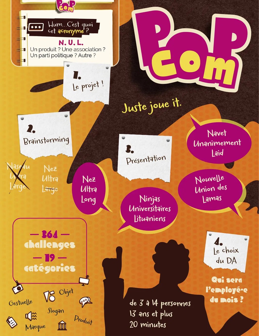Bienvenue chez Pop Com ! La crème des agences publicitaires et pour briller il va falloir avoir du génie ! Vous allez tour à tour rédiger des slogans, dessiner des logos, prendre la pose, jouer la comédie, et même faire la voix off d’une publicité. Alors, à vous de jouer : sublimez les campagnes de pub avec vos idées innovantes et votre créativité débordante. Plongez dans l’aventure publicitaire et faites briller Pop Com de tout votre talent ! Un jeu d’ambiance stimulant et créatifs ponctués de challenges déjantés hilarants.
