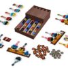 Contenu : 1 Livret de Règles, 4 plateaux Paillasse, 64 tuiles Potion, 80 billes Ingrédient (4 couleurs), 15 pions Compétence, 21 pions Coup de Pouce, 1 pion Premier Joueur et 1 Distributeur en plastique.
