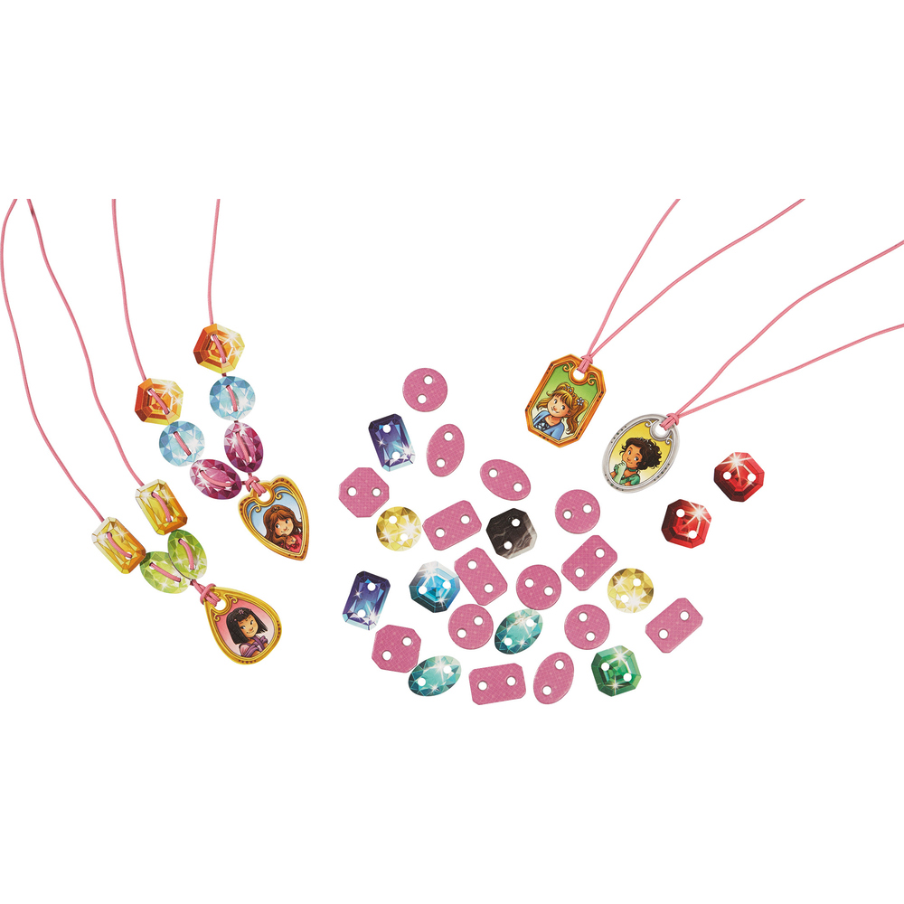 4 amulettes, 4 cordons à enfiler, 36 plaquettes de pierres précieuses de 4 formes différentes, 1 règle du jeu.