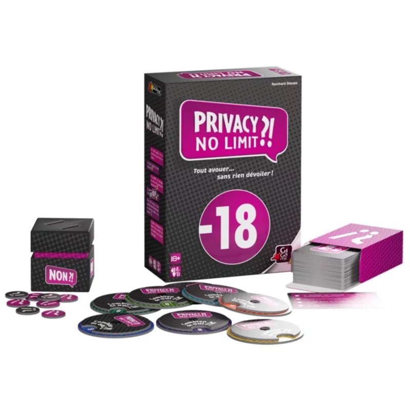 Privacy No Limit est la version sans limite de Privacy, un grand classique des jeux d’ambiance. Réservé aux joueurs de plus de 18 ans, ce jeu reprend les règles de base de l’édition originale. Petites questions intimes entre amis… La version encore plus « interdite aux moins de 18 ans » de Privacy…