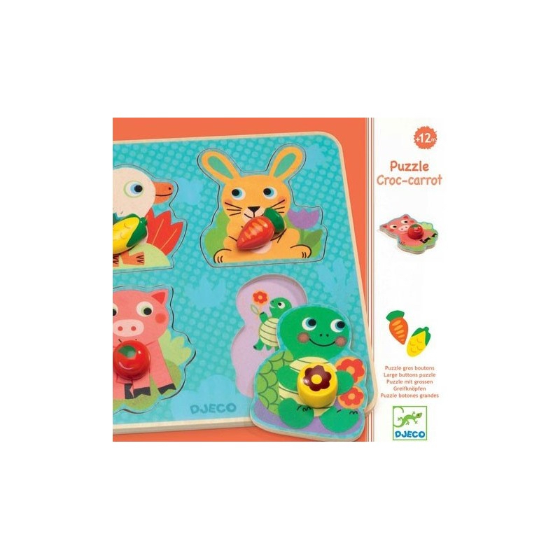 Découvrez le Croc-carrot de Djeco, premier puzzle d’encastrement en bois sur le thème des animaux de la campagne avec des gros boutons à la forme des aliments que mange l’animal ! Des pièces magnifiquement peintes, faciles à attraper, placer et replacer sur le plateau.