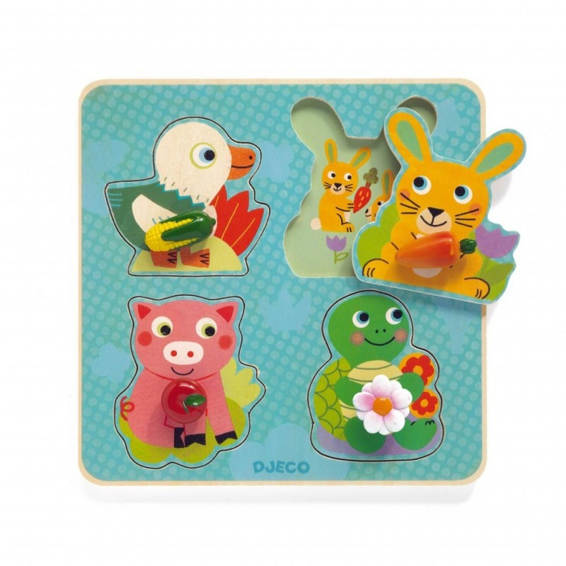 Ce puzzle à encastrements se compose d’un plateau carré de 21 cm de côté et de 4 pièces en bois aux silhouettes d’animaux : le lapin, le canard, le cochon et une tortue. Les pièces sont facile à saisir pour les petites mains car elles comprennent des poignées aux formes évocatrices associée à chaque animal : une carotte, l’épis de maïs, une pomme et une fleur ! Grâce à ce puzzle, les enfants à partir de 12 mois vont pouvoir développer leur motricité fine mais aussi partir à la découverte des animaux de la campagne. Pour faciliter l’apprentissage, sur le fond du plateau on découvre (lorsque que la pièce est enlevée) l’animal illustré dans une autre situation.