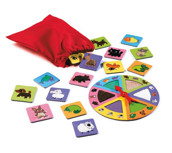 A son tour, l’enfant va faire tourner la petite flèche de la roue. Il va toucher et se familiariser avec la texture de la zone indiquée, puis va devoir fouiller dans le sac pour retrouver un animal de cette catégorie. Pour cela, il ne pourra pas bien évidemment regarder mais devra reconnaître les animaux au toucher. Chaque petite tuile est recouverte d’une des textures de la roue.