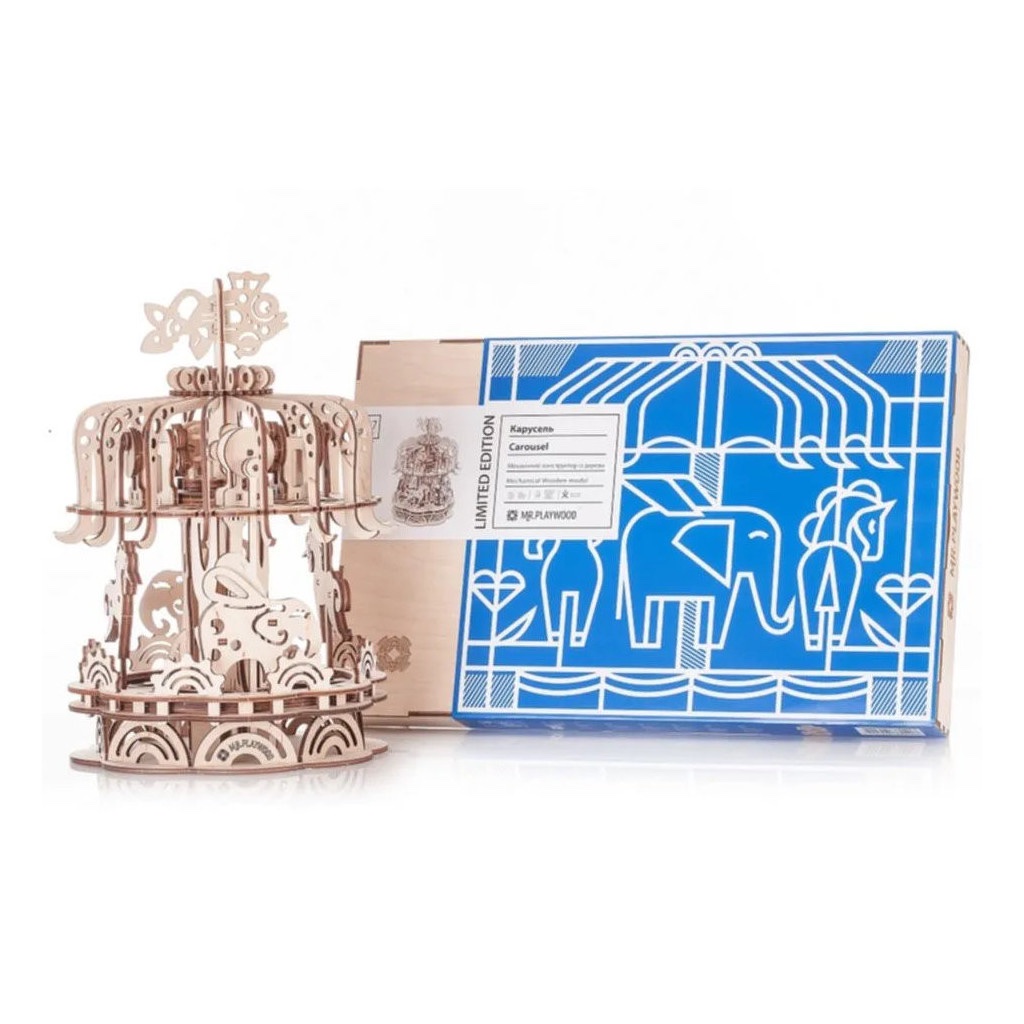 Mr Playwood propose une magnifique collection de puzzle en bois et en 3D qui s’animent comme par magie. Assemblez puis faites tourner ce magnifique carrousel et ses animaux fantastiques !