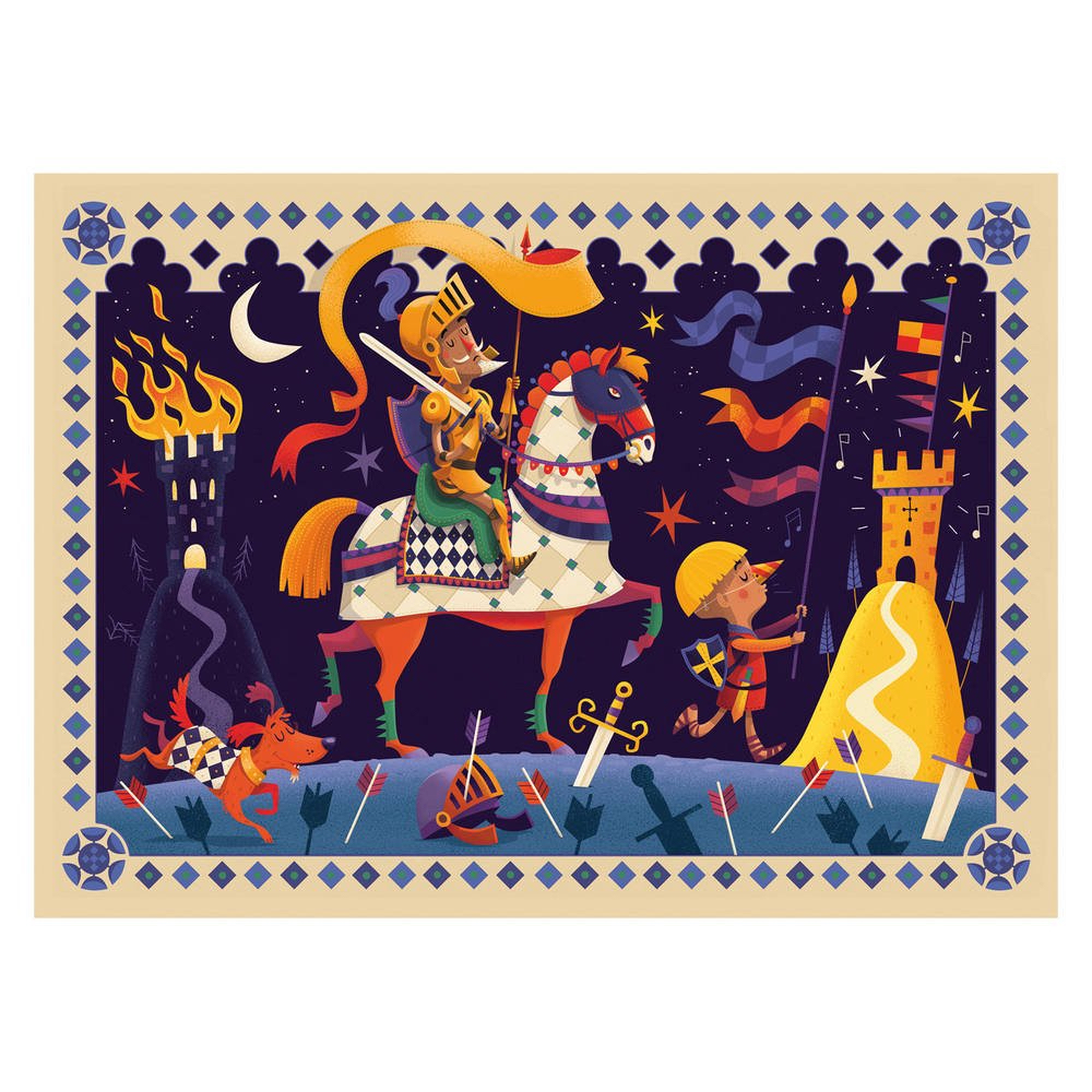 Le puzzle Don Quichotte de Djeco composé de 36 pièces est présenté dans une boîte originale. Ce puzzle illustre une scène joliment colorée du hardi Chevalier et de son compère paradant !