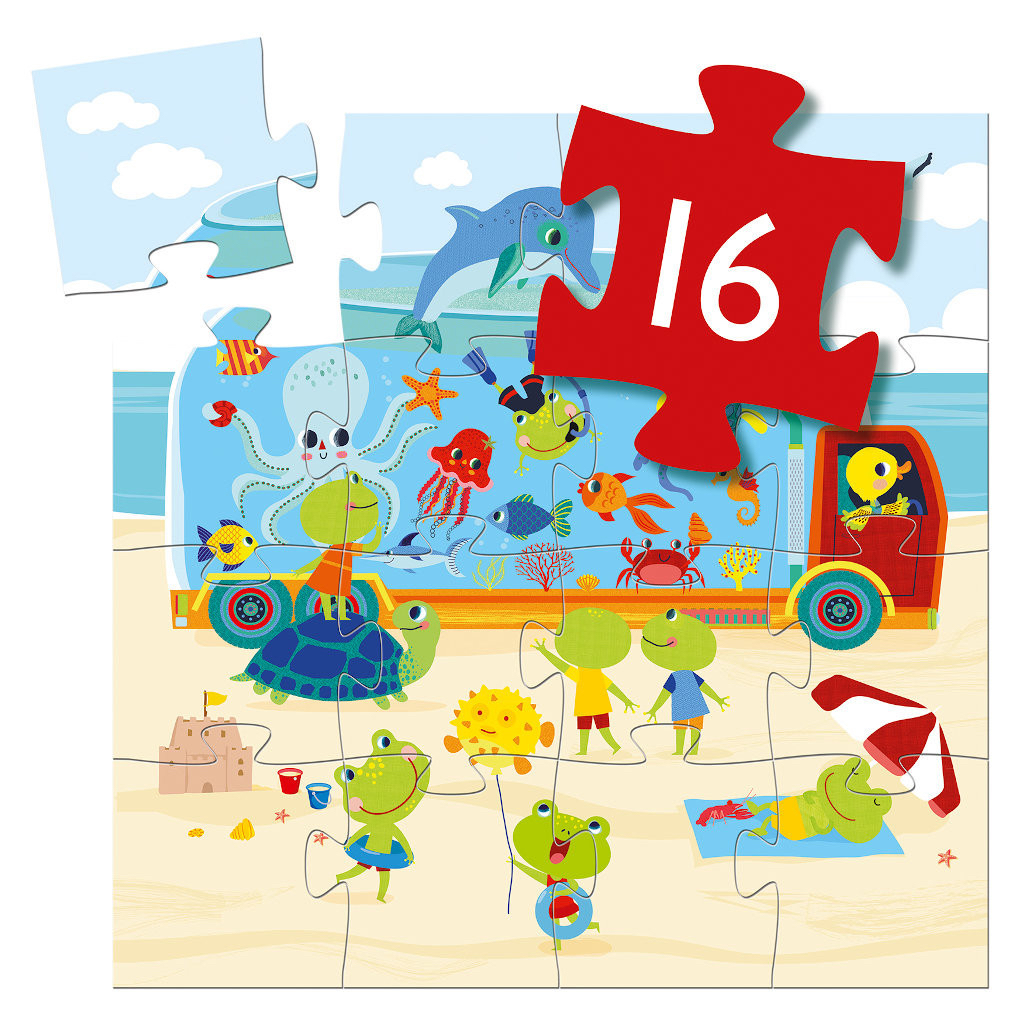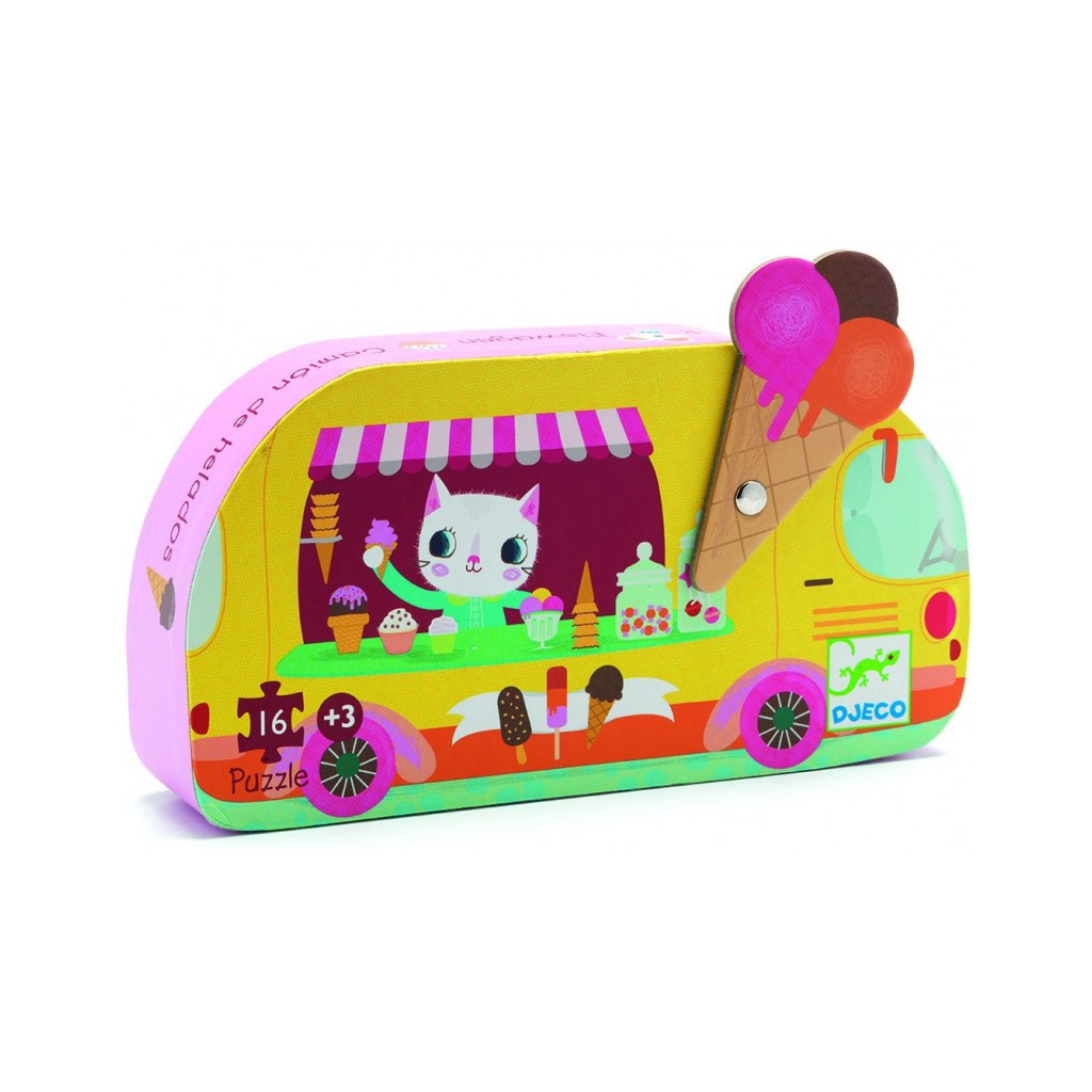 Le puzzle Le Glacier de Djeco composé de 16 pièces est présenté dans une boîte originale en forme de Camion glacier. Ce puzzle illustre une scène joliment colorée du camion au parc régalant plein de personnages avec ses bonnes glaces.