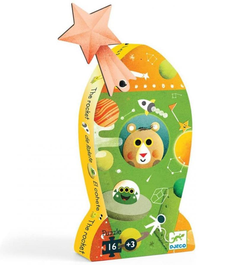 Le puzzle The Rocket de Djeco fait parti de la grande famille des puzzles silhouettes. Celui ci représente une scène dans l’espace avec fusées, planètes, étoiles et personnages fantastiques. Dans un puzzle coloré de 16 pièces. La boite en forme de fusée s’anime grâce à la comète mobile.