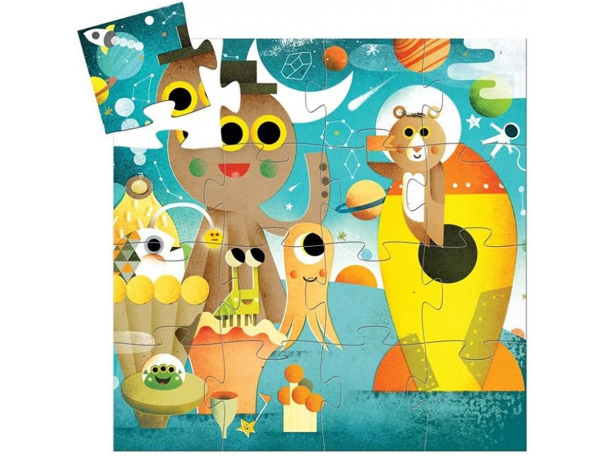 Le puzzle The Rocket de Djeco composé de 16 pièces est présenté dans une boîte originale en forme de fusée. Ce puzzle illustre une scène joliment colorée de fusées, planètes, étoiles et personnages fantastiques, dans l’espace.