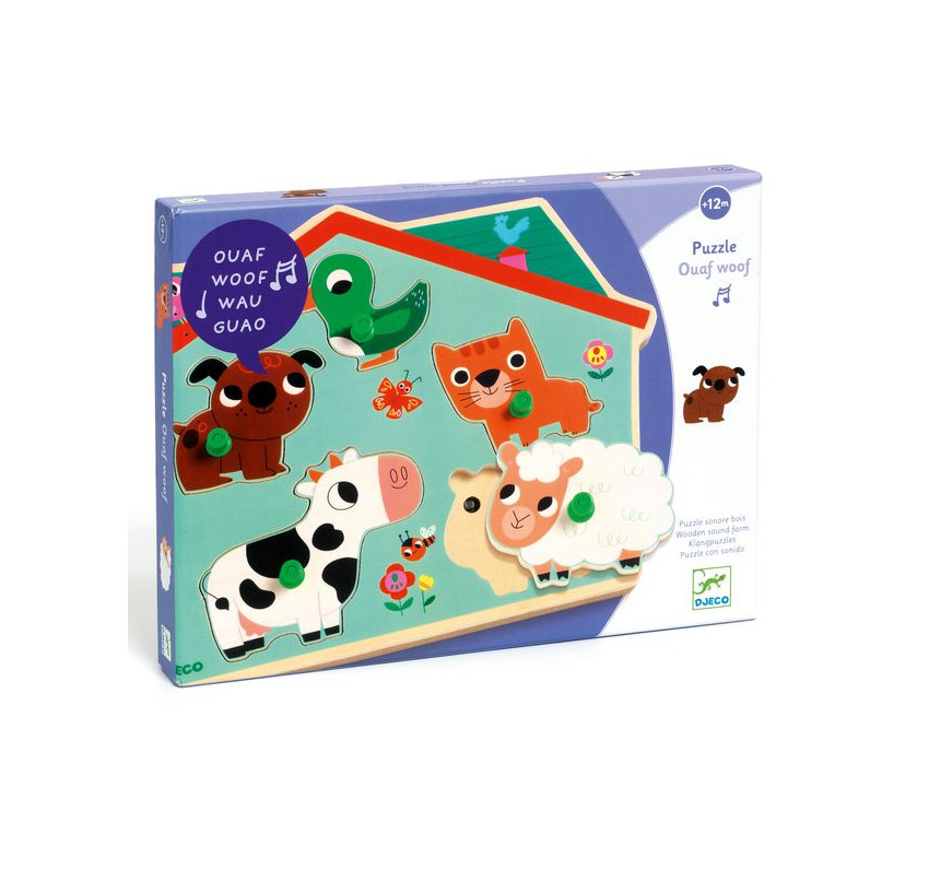 Découvrez le puzzle sonore Ouaf Woof de Djeco, un puzzle et jeu d’encastrement en bois musical pour les enfants dès 1 an.