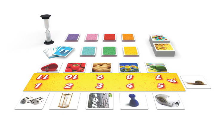 Contenu du jeu : 150 cartes photos (recto verso = 300 images), 1 sablier (90 secondes), 88 cartes numérotées de 1 à 11 (8 couleurs), 11 jetons blancs numérotés de 1 à 11, Feuilles de score et crayons et 1 livret de règles.