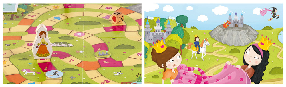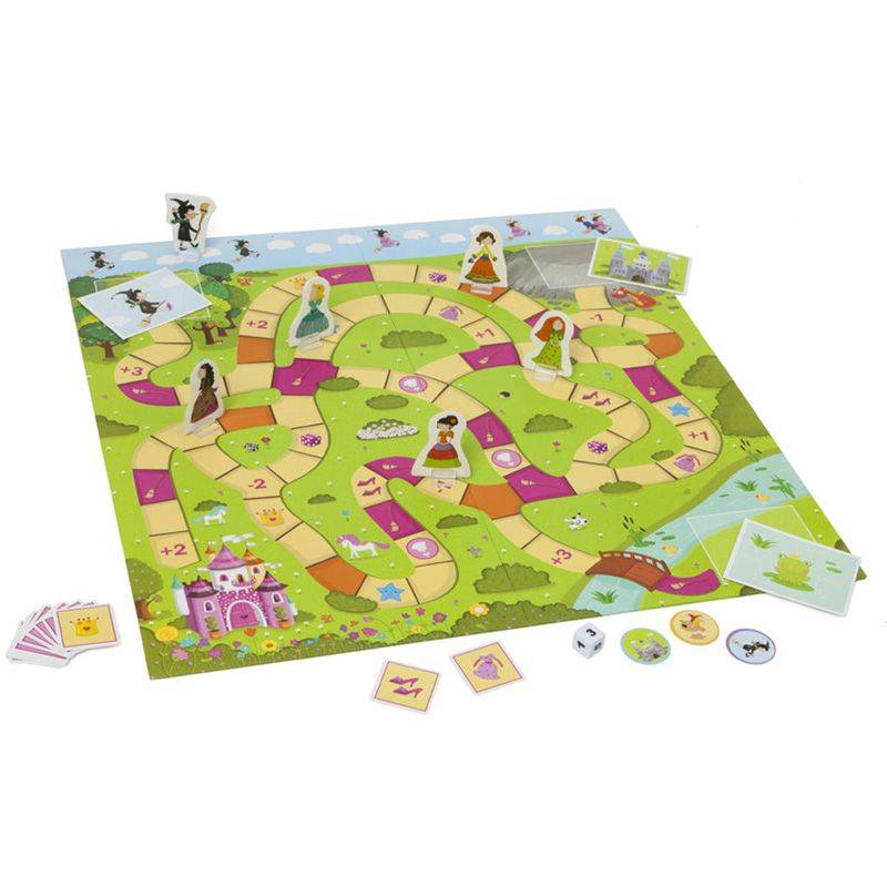 A chaque lancer de dé, à toi de choisir le meilleur chemin pour récupérer au plus vite la tenue complète de princesse : la robe, les chaussures et la couronne. Une fois que tu as les 3 accessoires, tu peux te diriger vers l’un de trois châteaux pour découvrir si le Prince est là. Il est là ? C’est gagné, sinon tu continues ton chemin vers un autre château. Mais, attention le temps presse car la sorcière est aussi, à la recherche du prince…