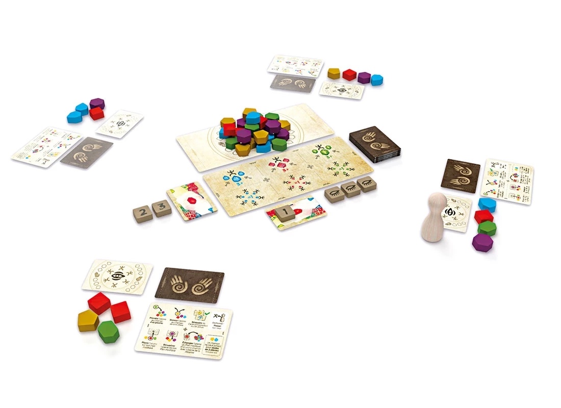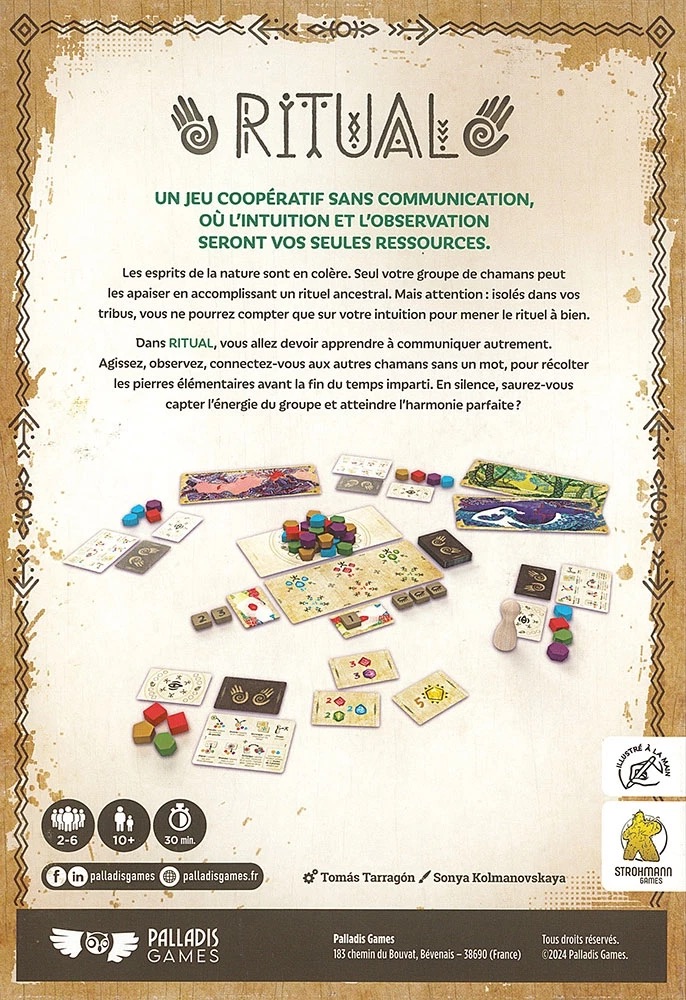 Ritual… est un jeu de cartes coopératif de déduction dans lequel vous devrez accomplir ensemble les six étapes d’un rituel mystique, sans jamais parler ni faire de gestes explicites. Vous communiquez sur vos actions au lieu de parler. Pour cela, vous prenez des pierres de couleur à d’autres chamans ou vous leur en donnez. Les intentions de chacun devront être devinées à travers vos actions seules, dans un silence total, pour atteindre l’équilibre et réussir la cérémonie dans le temps imparti. Atteignez l’harmonie chamanique..!