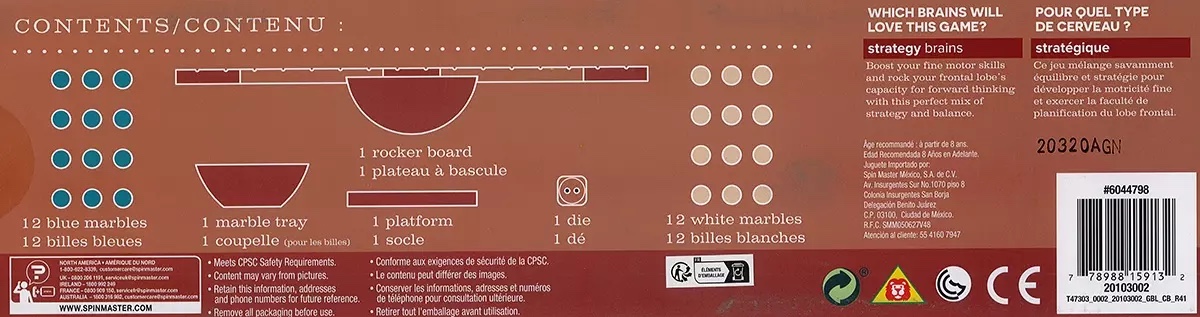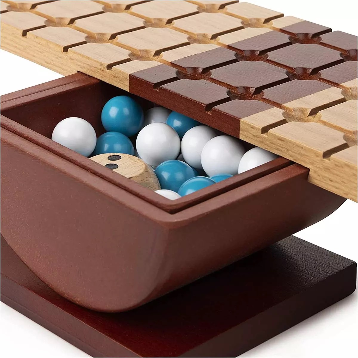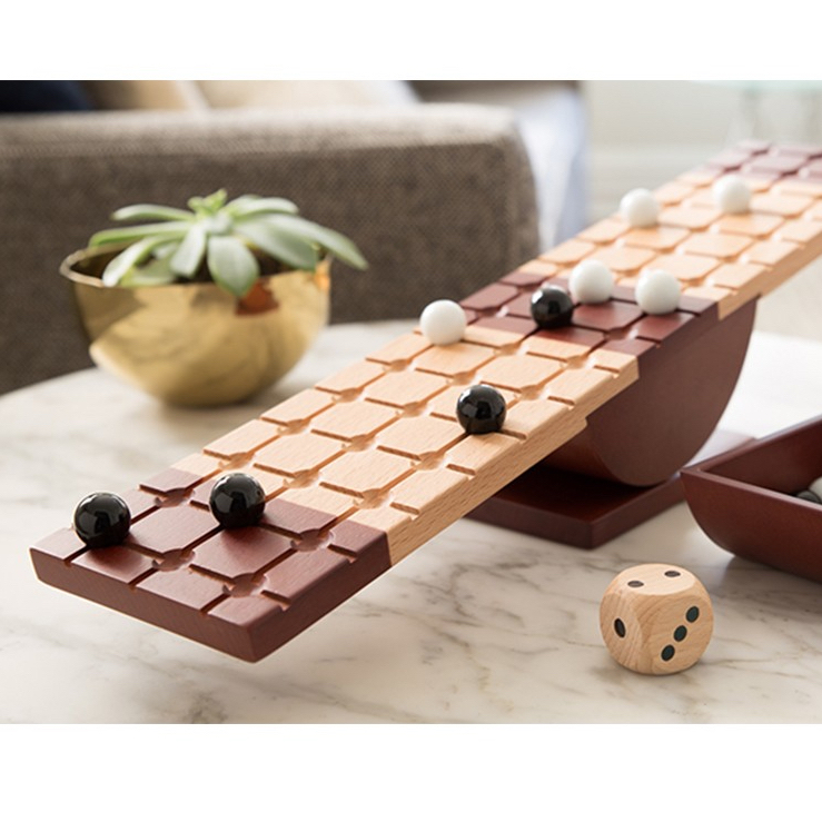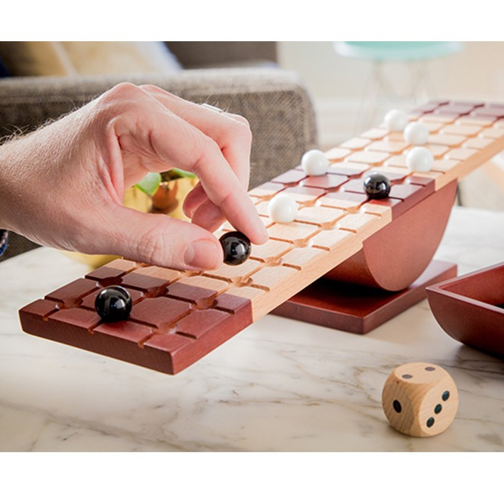 Contenu : 1 plateau en bois à bascule, 1 socle en bois, 1 coupelle, un dé, 12 billes bleues, 12 billes blanches, 1 règles du jeu.