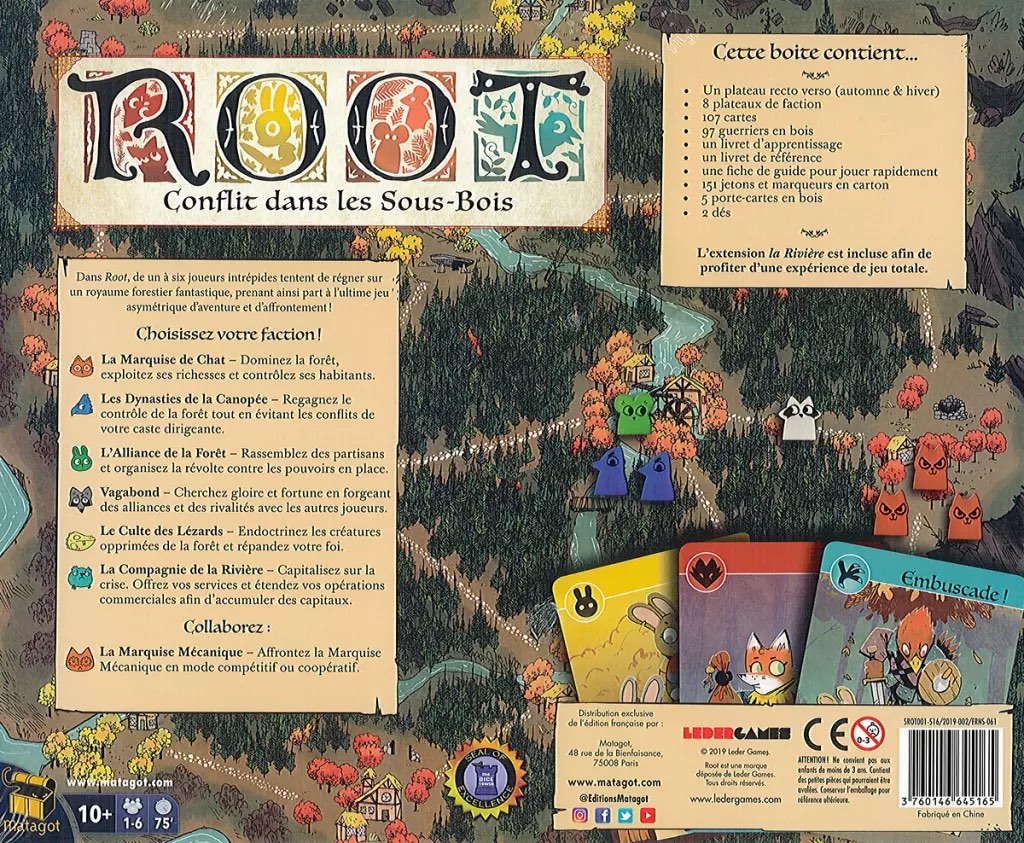 Root est un jeu asymétrique d’aventure et de guerre dans lequel les joueurs se battent pour le contrôle d’une vaste région sauvage. Cette version française du jeu est une édition spéciale qui comprend le jeu de base et son extension.
