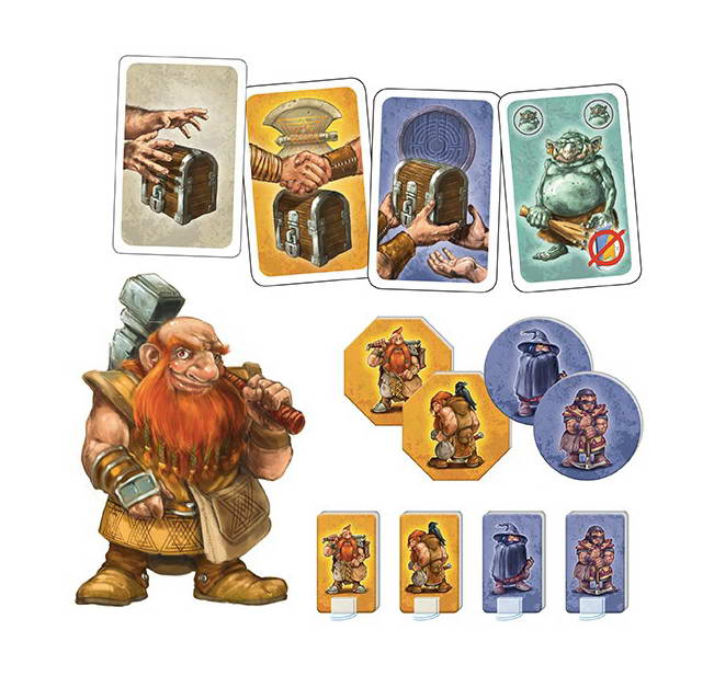 Contenu : 92 cartes, 1 plateau de jeu, 10 pions nains et support, 10 jetons nains, 15 jetons forêt, 32 jetons point de victoire, règle du jeu.