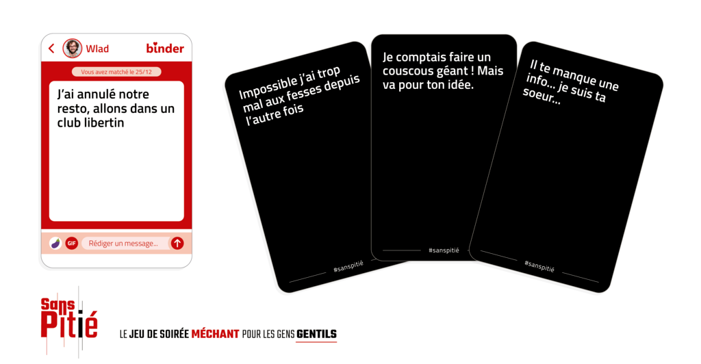 «Sans Pitié, le jeu de soirée méchant pour les gentils», est un jeu à l’humour corrosif destiné aux adultes. Le concept repose sur nos réponses aux interactions de la vie quotidienne (emails, appels, conversations, réseaux sociaux…).