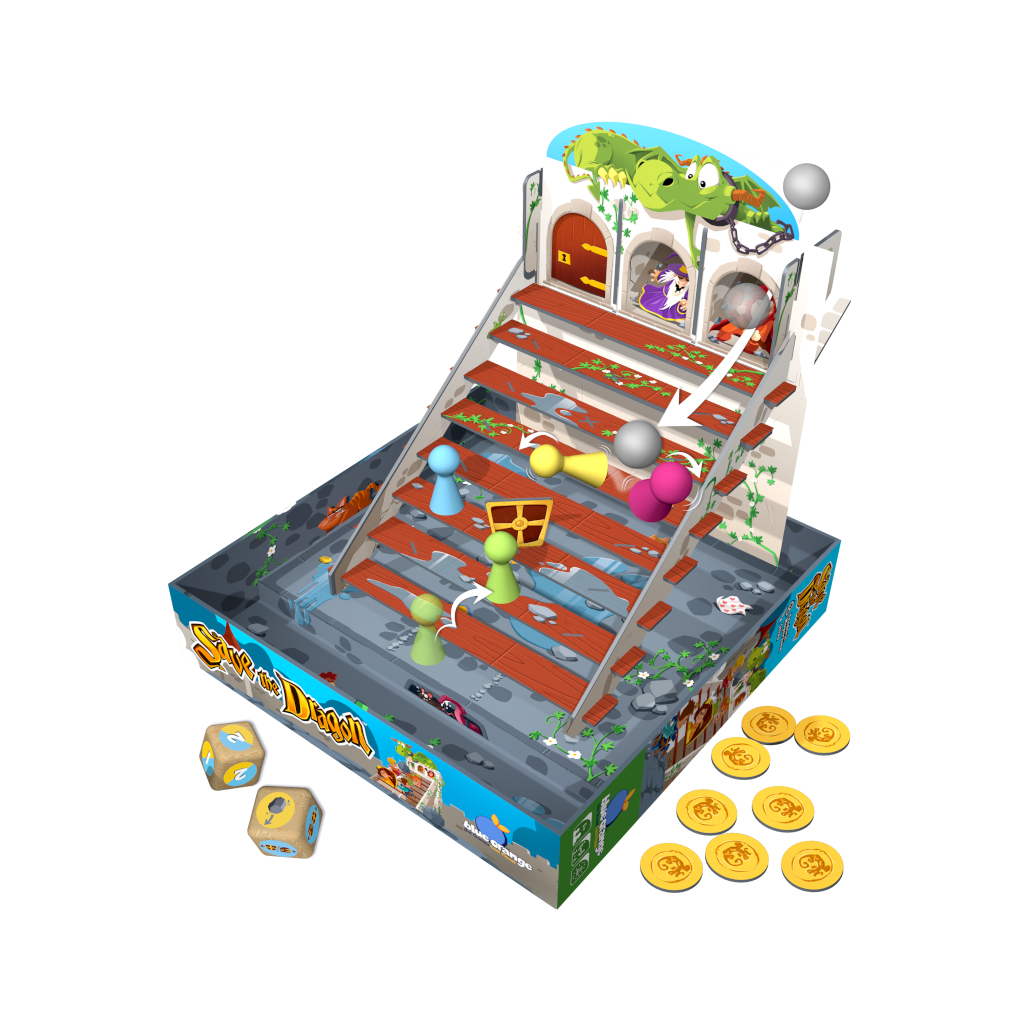 Contenu : L’escalier du grand donjon, La chambre du dragon, La porte de la chambre du dragon, 1 rocher, 4 pions Princesse / Prince, 2 dés spéciaux (1 dé de Déplacement + 1 dé d’Actions), 12 jetons Bonus, 1 bouclier.
