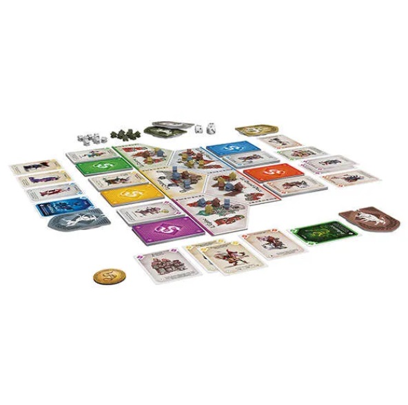 Contenu : 130 cartes – 40 pions – 5 mini-plateaux – 5 compteurs de scores – 1 pion 1er joueur – 3 dés personnalisés – 5 cartes Aide de jeu – 5 pions « complet » – 1 compteur de jours – Règle du jeu.