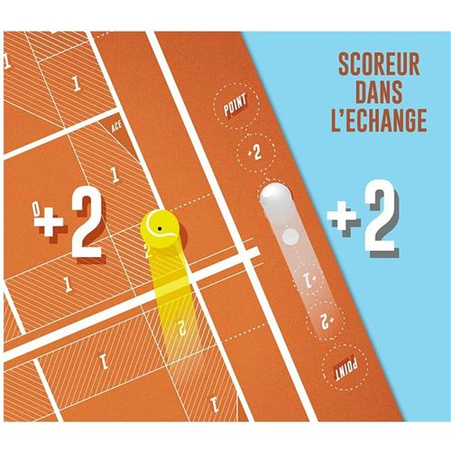 La mécanique de génie, c’est le compteur d’échange. Il compte 3 cases de chaque côté du filet, une au centre. Au début d’un échange le curseur est placé sur la case 0. Chaque coup joué a une valeur égale à celle inscrite sur la case où atterrit votre balle (de 0 à 3). La valeur est plus importante sur les couloirs ou au fond du cours, plus difficiles à atteindre. Si la valeur de la case est de 2, vous poussez le curseur de deux cases vers l’adversaire. Si en réponse il renvoie la balle sur une case 3, il repousse le curseur de 3, et ainsi de suite, jusqu’à ce qu’il atteigne l’une des cases 3, marquant le point.