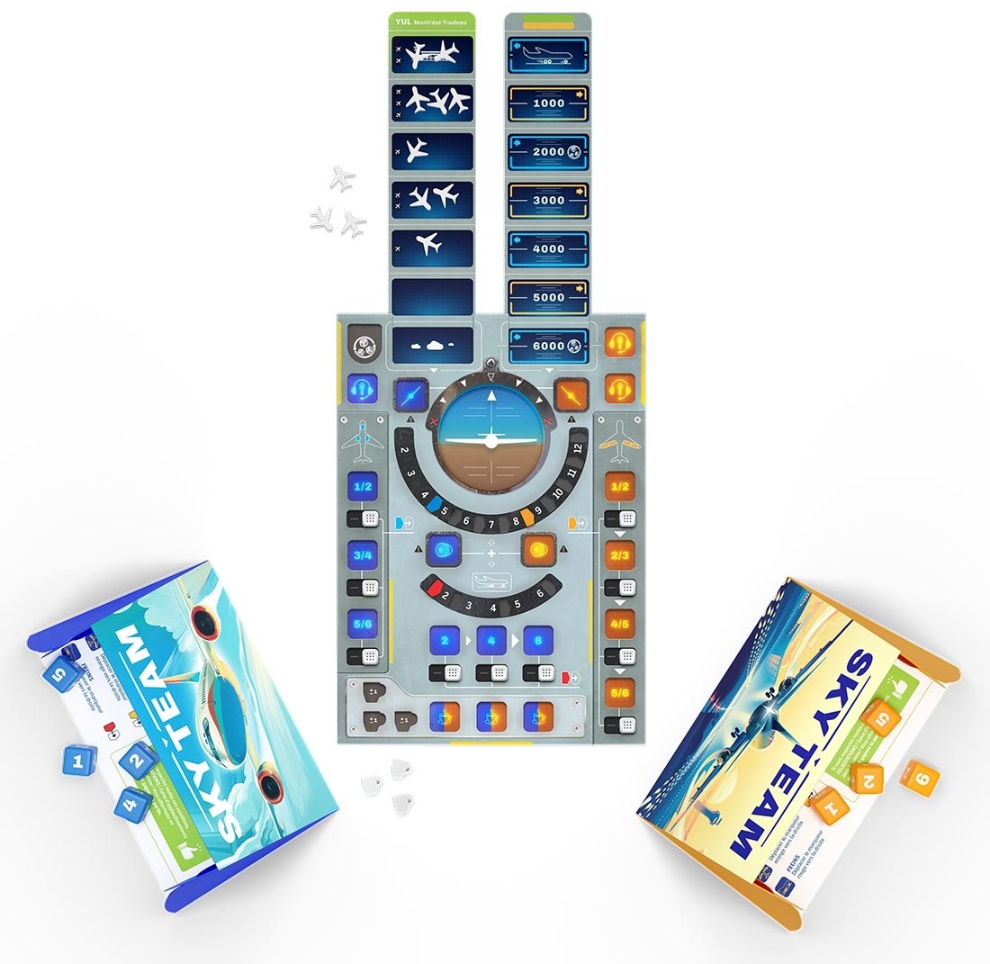 Dans Sky Team, chaque tour est une nouvelle étape de votre vol, où vous devrez placer stratégiquement vos dés sur le tableau de bord de l’avion pour suivre la procédure d’atterrissage. La coordination entre vous et votre co-pilote est cruciale pour réussir à poser l’appareil en douceur. Les défis sont nombreux : surveiller l’axe de l’avion, contrôler la vitesse, déployer les volets, sortir le train d’atterrissage, et même contacter la tour de contrôle pour réguler la circulation aérienne. De plus, vous avez la possibilité de prendre un petit café pour améliorer votre concentration, ce qui peut modifier la valeur de vos dés et influencer le résultat de votre action. Cependant, les risques sont bien réels. Si l’avion s’incline trop et décroche, dépasse l’aéroport ou entre en collision avec un autre avion, la partie est perdue. Chaque vol est une course contre la montre, car vous devez gérer tous ces éléments tout en gardant un œil sur le ciel pour éviter les turbulences imprévisibles.