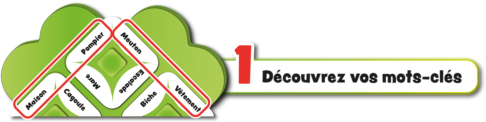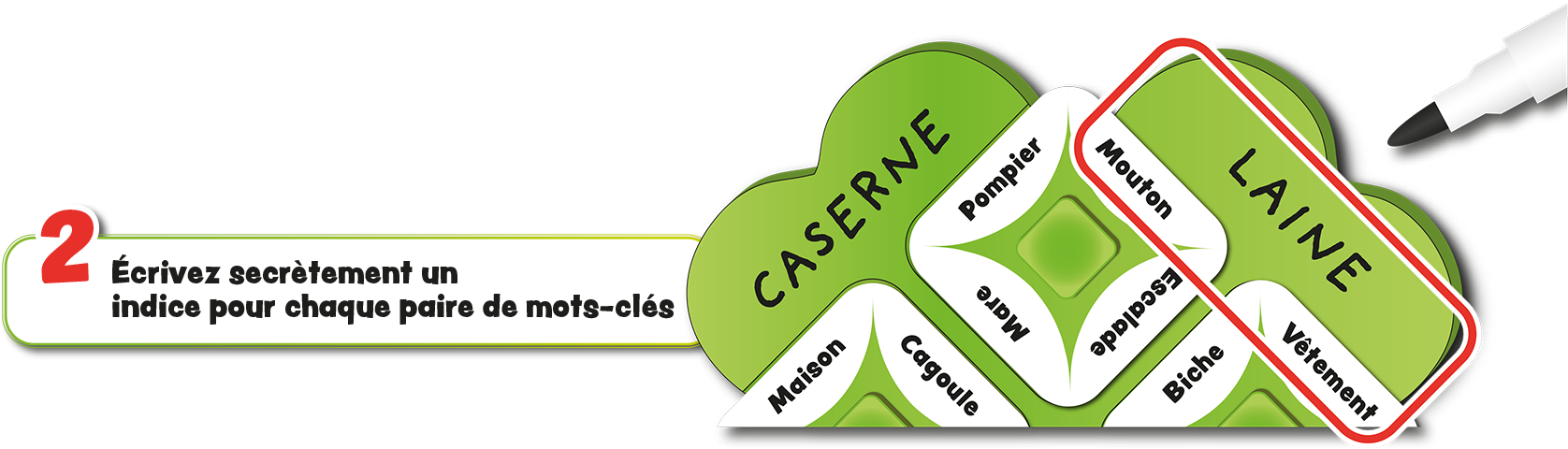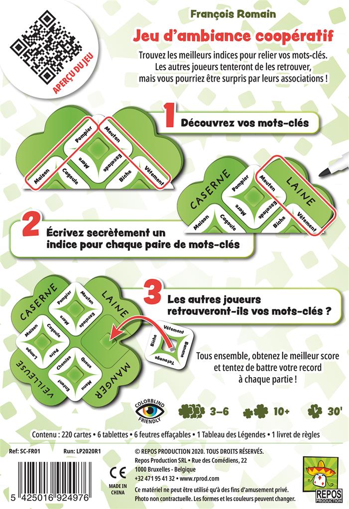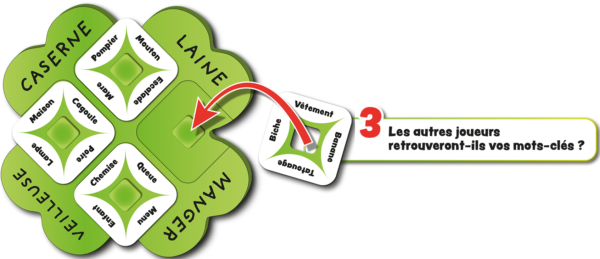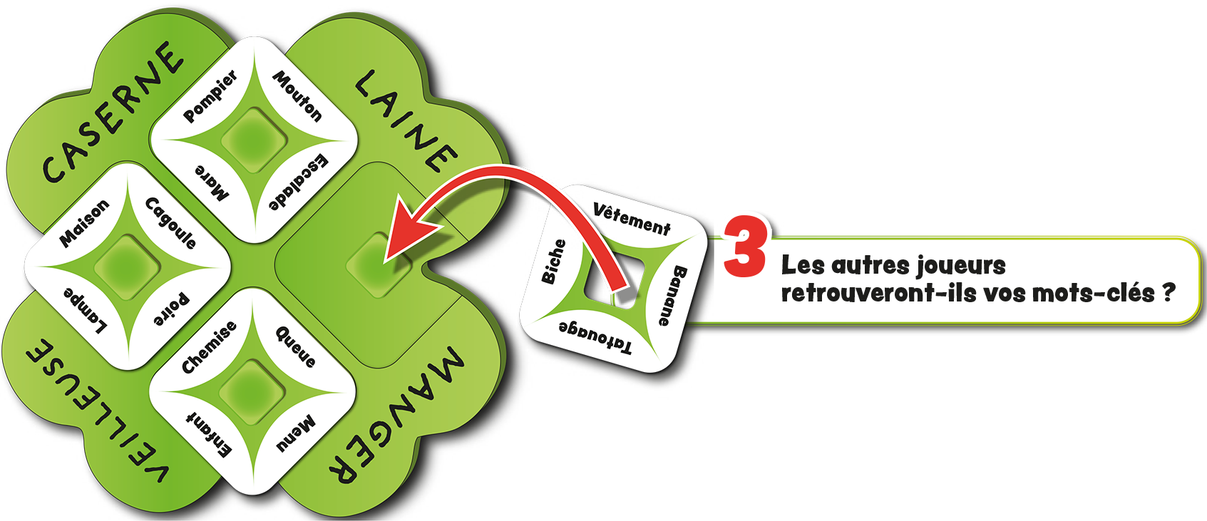 Chaque joueur créé 4 paires de Mots-Clés (x16) en inscrivant secrètement, sur sa tablette en forme de trèfle, le point commun qui les relie. Ces 4 mots deviennent alors des indices. Ensuite, les Mots-clés sont mélangés à 4 intrus et c’est ensemble, qu’il faut tenter de retrouver les 4 paires de Mots-Clés de chaque joueur. Plus on retrouve de mots, plus on marque de points.