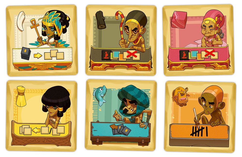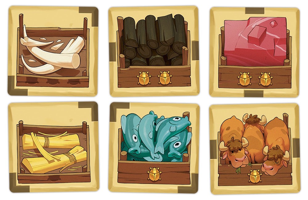 Contenu : 1 grand plateau Marché, 2 petits plateaux Corruption, 55 tuiles Marchandise, 10 tuiles Personnage, 13 jetons Pirogue, 13 jetons Deben, 1 sac, 1 pion Ankh, 2 grandes aides de jeu, 1 livret de règles.