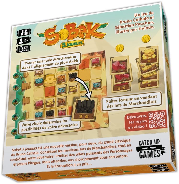 Sobek 2 Joueurs… Une nouvelle version, à deux, du classique de Bruno Cathala ! Soyez malin, voire fourbe, pour vendre les meilleurs lots de Marchandises tout en contrôlant votre adversaire. Mais attention, vos choix peuvent vous corrompre. Et la corruption a un prix…