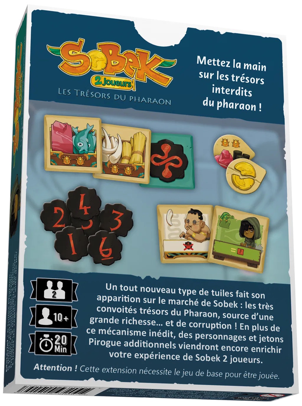 Sobek 2 joueurs s’enrichie d’une extension. Ici de nouvelles tuiles pour le marché de Sobek qui ne sont autres que les trésors du pharaon qui ne manquent pas de susciter les convoitises. Mais attention si c’est une source de plus grande richesse, c’est aussi prendre un risque de corruption supplémentaire. Un nouveau mécanisme mais aussi des personnages et jetons Pirogue additionnels pour agrémenter l’expérience ludique.