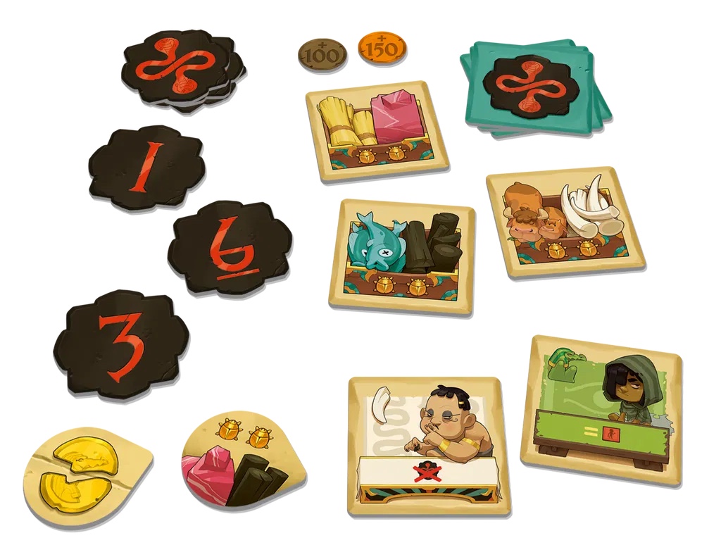 Contenu : 6 tuiles Pharaon, 6 jetons Corruption royale, 2 tuiles Personnage, 2 jetons Pirogue, 2 marqueurs de score, 1 aide de jeu, 1 livret de règles.