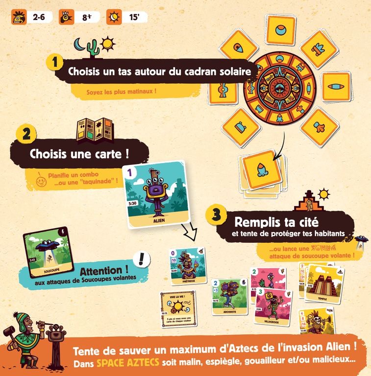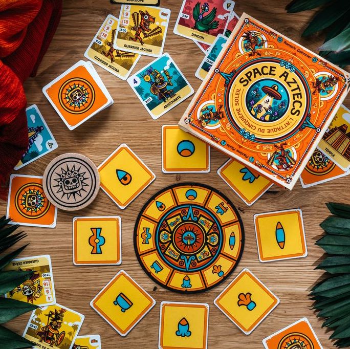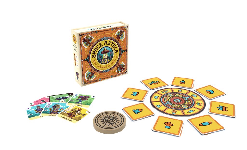 Les Aztecs sont attaqués par des aliens envahisseurs. À vous de rassembler les habitants de votre cité et de les protéger des attaques OVNI. Ces derniers sont particulièrement attirés par les villageois et les animaux qu’ils kidnappent dès qu’ils en ont l’occasion. Construisez des temples, demandez de l’aide aux Dieux, Tous les moyens sont bons pour se défaire de l’ennemi cosmique. Il faudra à chaque tour de jeu faire le bon choix. Je pose une carte pour faire des points, je protège celles déjà posées ou je vais marcher sur les plates-bandes de mes adversaires. Cette interaction directe permet à Space Aztecs de sortir du lot des jeux de collections.