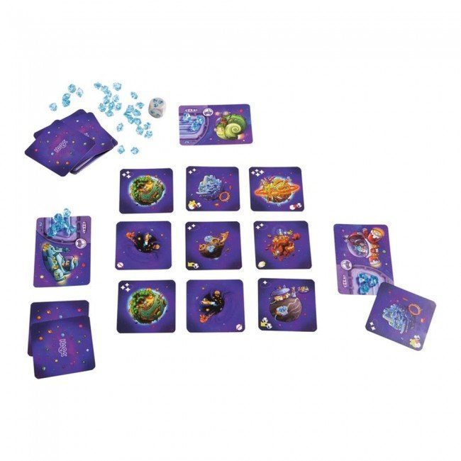 L’étendue infinie de l’univers… A bord de vos vaisseaux spatiaux partez à la découverte de planètes et galaxies lointaines ! Mais la sonde en forme de dé que vous avez envoyée a-t-elle bien atterri sur votre cible ? Et les cristaux de carburants suffiront-ils à voler jusqu’à la prochaine planète ? C’est en visant avec le dé que l’on peut marquer des points et collecter les étoiles d’explorateur tant convoitées.