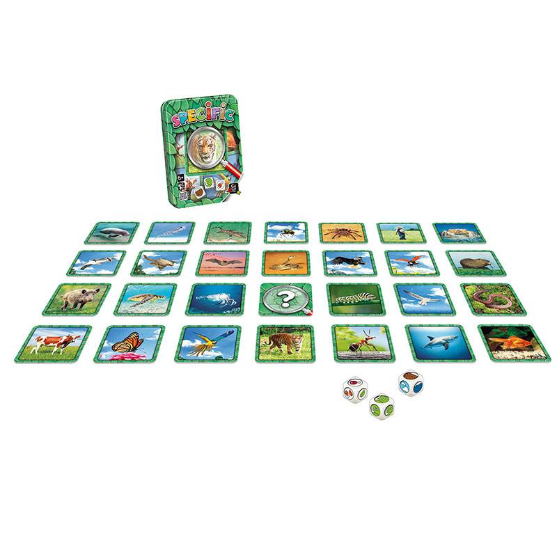 Lancez les dés et soyez le premier à désigner l’animal qui recoupe les trois caractéristiques annoncées : environnement, alimentation et nombre de pattes. Des variantes rendent le jeu accessible et adapté à toutes les tranches d’âge.