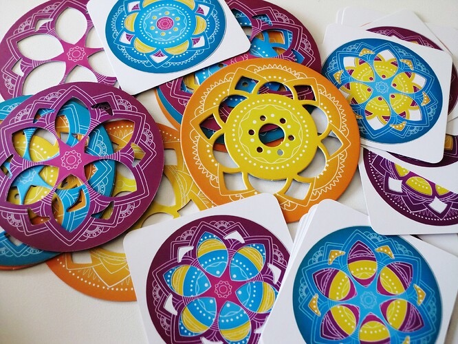 Chaque joueur joue avec 3 disques mandala, combinant couleurs et forme différents. Les joueurs vont essayer en même temps de recréer le mandala d’une carte défi. Les joueurs retournent leurs disques et choisissent le bon côté, les empilent dans le bon ordre et les orientent correctement. Le premier joueur à correctement réalisé le mandala gagne la carte. Le premier joueur à avoir 5 cartes défis gagne la partie. Mode solo inclus.