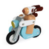 Les deux passagers sont des chiens avec leurs têtes montées sur ressort et des oreilles en feutrine qui semblent voler dans le vent. Leurs têtes oscillent lorsque le side-car bouge, ce qui amuse les enfants ! Cette moto pourra servir autant de jouet que d’élément décoratif.