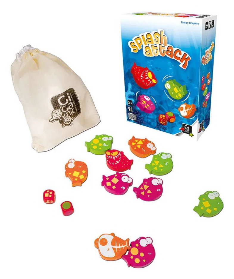 Contenu : 10 poissons en bois, 2 dès en bois, 1 sac, règle du jeu.