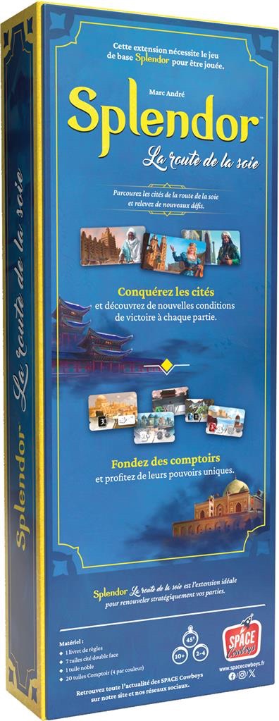Parcourez les cités de la route de la soie et relevez de nouveaux défis… Cette extension La route de la soie, contient 2 variantes pour le jeu Splendor, modifiant un aspect du jeu de base sans compliquer les règles ou rallonger la durée des parties. Conquérez les cités, fondez des comptoirs, profitez de leurs pouvoirs et découvrez de nouvelles conditions de victoire à chaque partie.