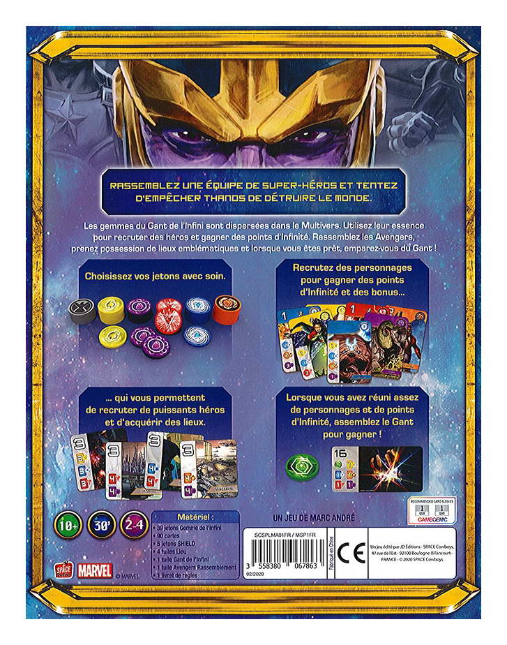 Même si le Splendor Marvel utilise les règles de base du Splendor et des matériaux de haute qualité, il a une structure de couleur différente, un nouveau déclencheur de fin de partie et de nouvelles conditions de victoire. Vous pouvez également gagner des points d’infini avec la tuile Avengers qui peut être passée d’un joueur à l’autre plusieurs fois au cours du jeu !