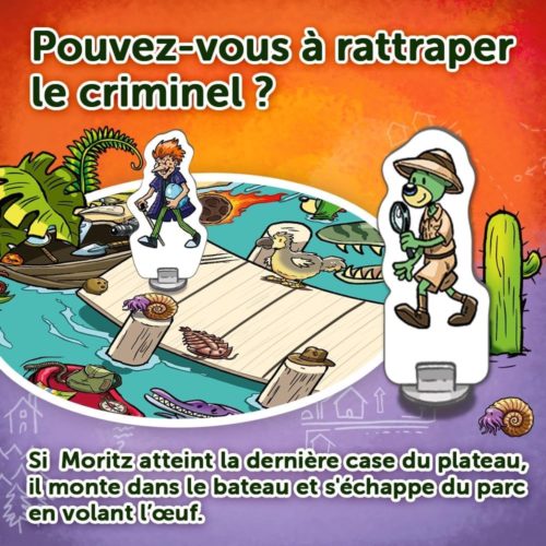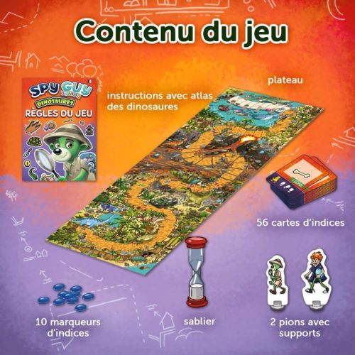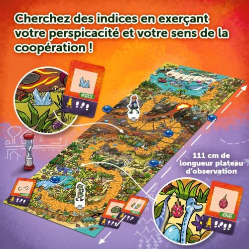 Contenu : 1 plateau de jeu de 111 cm, 2 personnages, 10 marqueurs d’indices, 56 cartes indices, Sablier, instructions règles du jeu et Atlas répertoire de dinosaures.